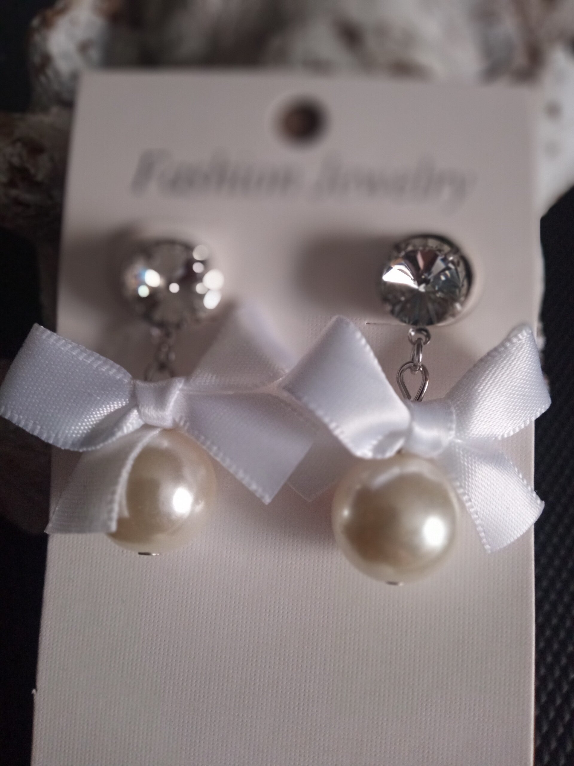 Parel-strik-strass oorbellen creme